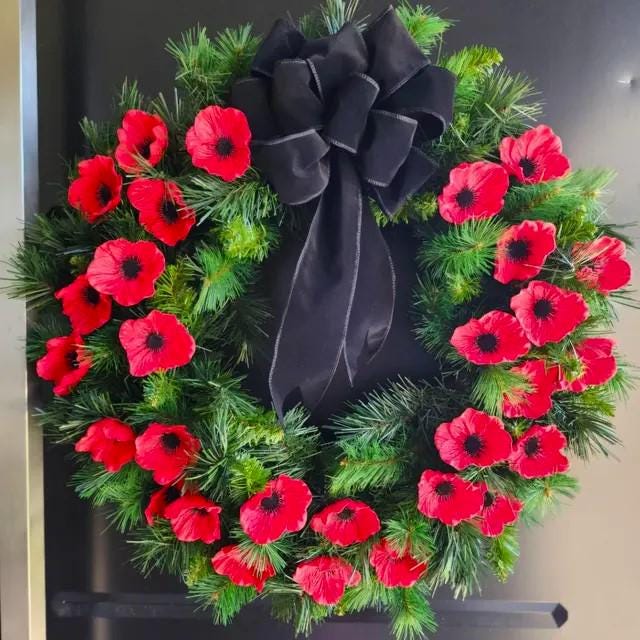 Large 24" Dble. Pine Wreath with Feel Real to the touch Red Poppies and Black Handmade Bow.
