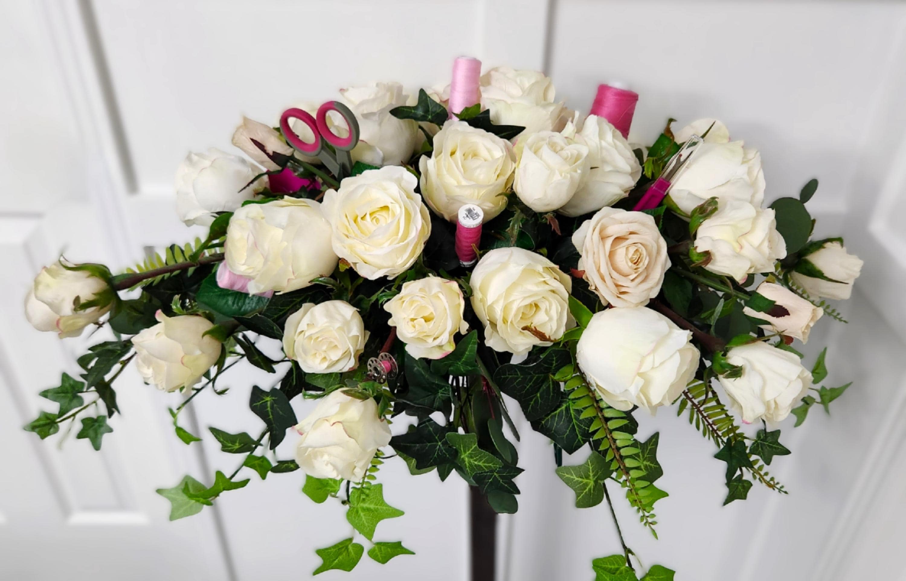 Custom Arrangement - All Premium Feel Real To The Touch Cream Roses with Sewing Notions added.